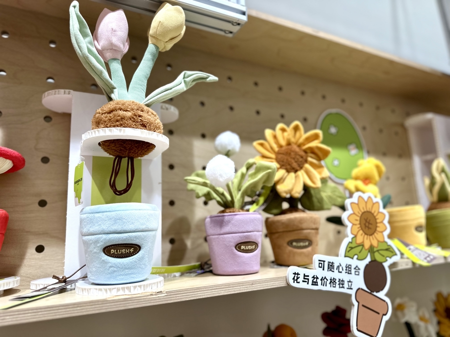 主打“无压力园艺”的毛绒盆栽系列亦然“大热点”,尤其受到年青东谈主的风趣。新民晚报记者看到,毛绒植物以郁金香、灵芝、向日葵、水仙、绿天鹅绒海芋等为原型,每株根部齐带着圆圆的“土球”,不错卡进不同造型的毛绒花盆中,随性组合就成了唯独无二的“定制款”。