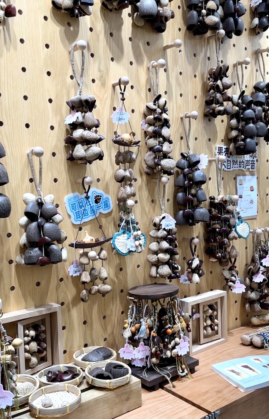 店内还有一整面“疗愈墙”,挂着数十款果壳手摇铃。这种手摇铃将自然果实外壳串在一谈,轻轻抚摸摇晃就能发出溪水潺潺、微风簌簌等当然声响,令东谈主仿佛踏进于丛林溪流旁,如同“大当然的白杂音发生器”。由于是纯手工制作,每串果壳铃的纹理、感情和声息齐不同,这也赋予其唯独无二的属性。此外,仙东谈主掌雨棍也卖得很好,高下动弹雨棍,内部的种子果实会发出流沙般的“唰唰”声,压力和心焦似乎也找到了暖热出口。
