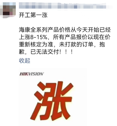 2月27日,财闻获悉,有安防居品销售东谈主士称,海康威视全系居品价钱今腾飞腾8-15%,并示意“悉数居品报价以当今价再行审定为准,未打款的订单已无法录用。”