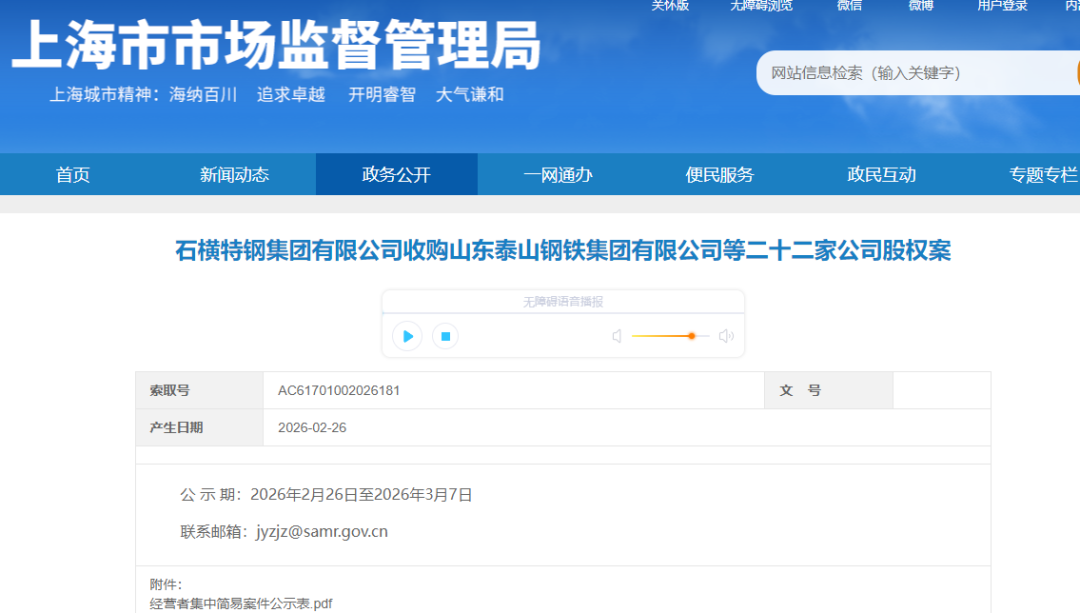 2026年2月26日,上海市阛阓监督措置局发布《石横特钢集团有限公司收购山东泰山钢铁集团有限公司等二十二家公司股权案》公示,笃定如下: