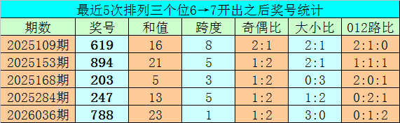 1、摆列三前两期个位隔离开出号码6和7,历史上个位号码斡旋两期隔离出现6和7时,共有67次。在最近5次出面前,其下期隔离出现号码:619、894、203、247、788;