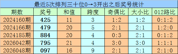 1、最近两期摆列三十位号码开出号码隔离为0和3,历史上十位号码斡旋两期同期出现号码0和3的奖号共开出71期。最近五次下期开出号码为:425、479、884、795、097;