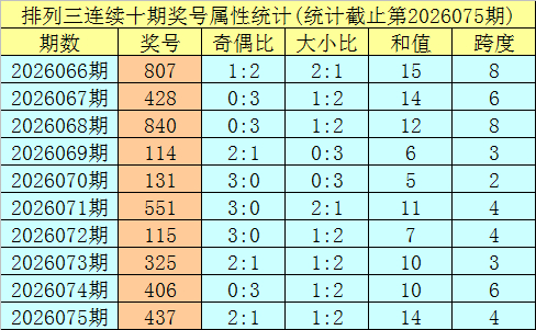 上期追念:胪列三第2026075期奖号:437。类型:组六,奇偶格式:偶奇奇,大小格式:小小大,和值:14,跨度:4。