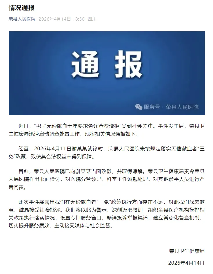 经查,2026年4月11日谢某某就诊时,荣县东说念主民病院未按端正落实无偿献血者“三免”战术,以致其正当职权未得到保险。