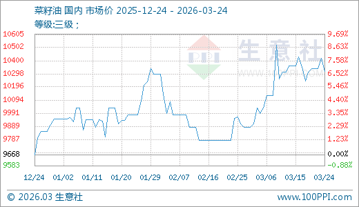 菜籽油03月24日最新价钱10320.00元/吨,最近30天上升5.52%,线上配资平台20天上升3.30%,90天上升6.74%。