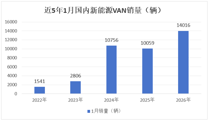 上图显现,2026年1月国内新动力VAN销量创近5年同时最高。回顾到2022年之前任何年份的1月,国内新动力VAN销量均未超出1500辆,因此不错料定,2026年1月国内新动力VAN销量也创下史上同时最高。