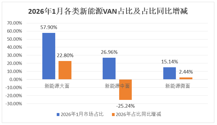 具体来看,按车型长度及装载容积分袂,2026年1月国内新动力VAN车型中的大面、中面和微面销量增减统计如下: