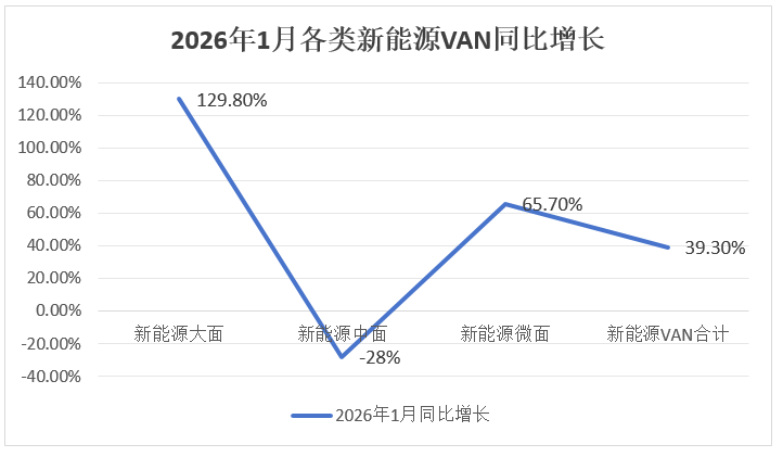 上图表显现,2026年1月国内新动力VAN销量同比增长39.3%,与2025年2月--12月的“11连增”组成了“12连涨”,彰显了近期以来国内新动力VAN市集抓续闪现的增长势头,因此成为本年1月我国新动力VAN市集的一个难题特色。主要得益于一是中枢城市对新动力VAN不限行、不限号、路权优先;二是蓝牌新规+合规化,倒逼多地淘汰不对规的燃油VAN车型,使得新动力VAN成为合规替代首选;三是新家具密集上市。主要包括正向电动平台的大空间、长续航及智能化+餍足性的新动力VAN抑遏推向市集;四是充电站抑遏完善,新动力VAN补能愈加浅陋。