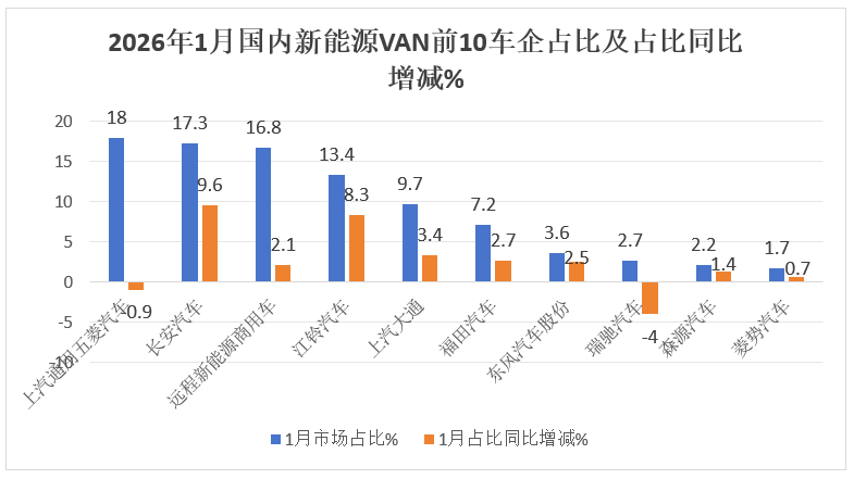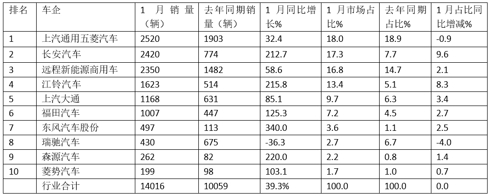 2026年1月国内新动力VAN前10车企销量同比、市集占等到占比同比变化统计(数据开首:结尾上牌)