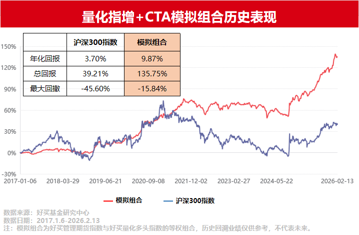 由上图可见,2017年1月到2026年2月量化指增+CTA的模拟组合竣事了9.87%的历史年化陈述,期间最大回撤为-15.84%。行为对比,沪深300指数区间年会陈述为3.70%,最大回撤为-45.60%。